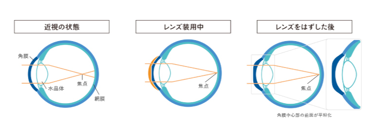 いくつかのカーブを組み合わせた特殊な形状のハードコンタクトレンズを就寝中に装用し、角膜の前面形状をやや平らに変化させ、近視を矯正します。日中はレンズを装用しません。